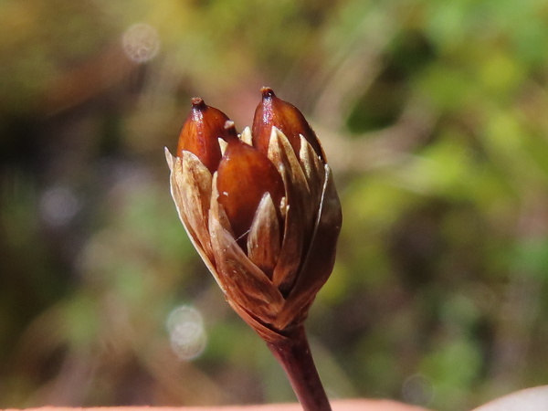 The flowers (and fruits) of Juncus triglumis are typically borne in a horizontal row, with the lowest bract shorter than the inflorescence.
